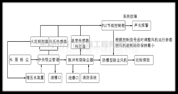 2)風(fēng)機在除塵器末端,避免木料中的金屬物通過管道直接吸入風(fēng)機中,將與風(fēng)葉摩擦的火花吹進布袋除塵器中,導(dǎo)致安全隱患。