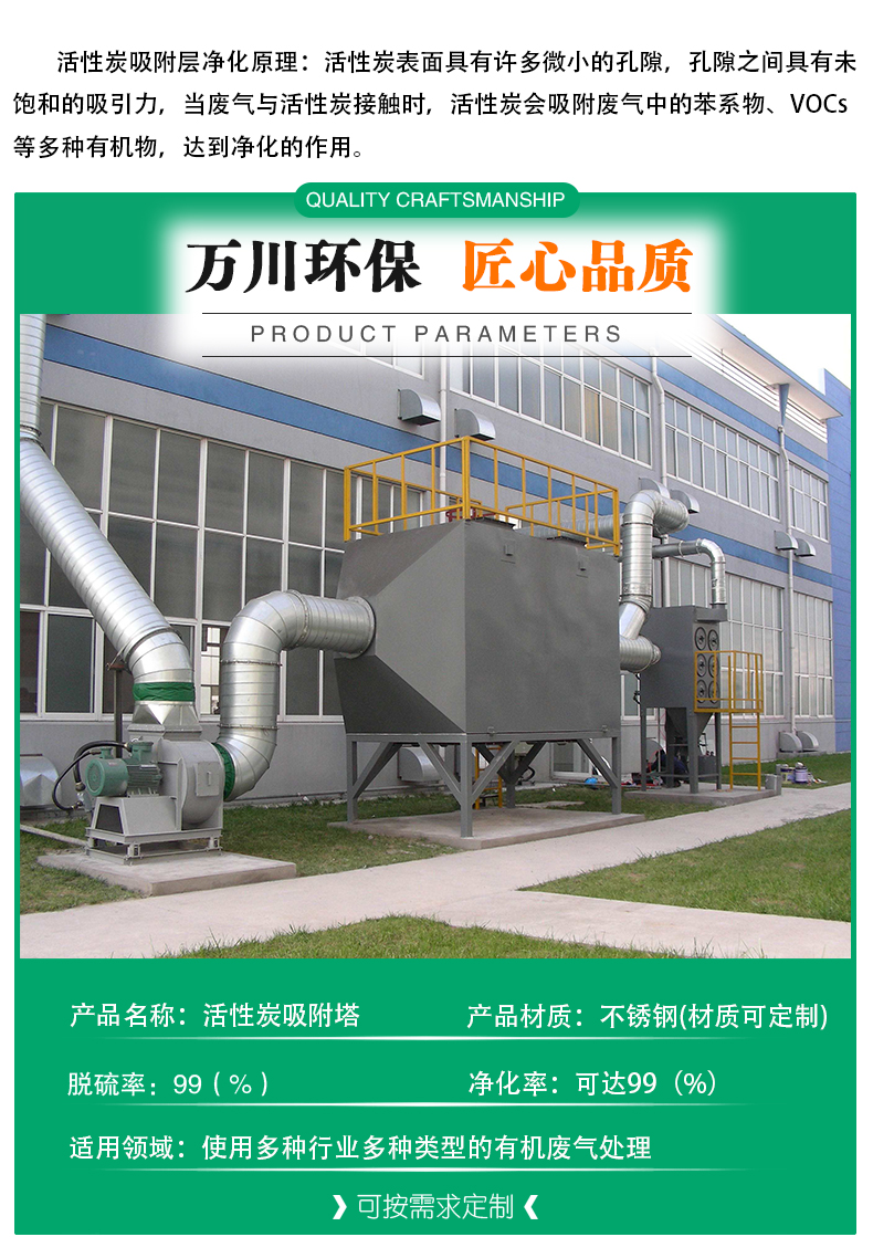 簡介:活性炭被廣泛應(yīng)用于工業(yè)上,再后來發(fā)明了活性炭吸附塔。活性炭吸附裝置是利用活性炭的原理設(shè)計(jì)而成的,活性炭表面具有許多孔隙,這些孔隙之間存在著吸引力,當(dāng)廢氣與活性炭接觸時(shí),可以吸附廢氣分子,所以在很多工廠都會(huì)看到活性炭吸附塔的身影。