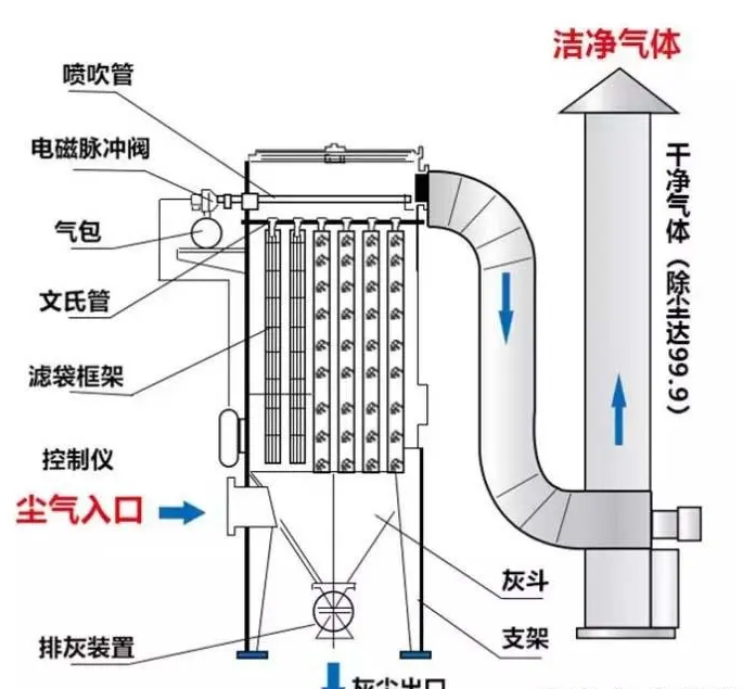 含塵氣體由風機通過吸塵管吸入箱體,進入濾袋過濾,粉塵顆粒被濾袋阻留在表面,經(jīng)過過濾的凈化氣體由出風口排出,可直接排放在室內循環(huán)使用,也可根據(jù)需要排出室外。整個除塵過濾是一個重力,慣性力,碰撞,靜電吸附,篩濾等綜合效應的結果。除塵器連續(xù)工作一段時間后,濾袋表面的粉塵不斷增加,繼而進行清灰,粉塵抖落在集塵器(抽屜)中,再由人工進行處理 。