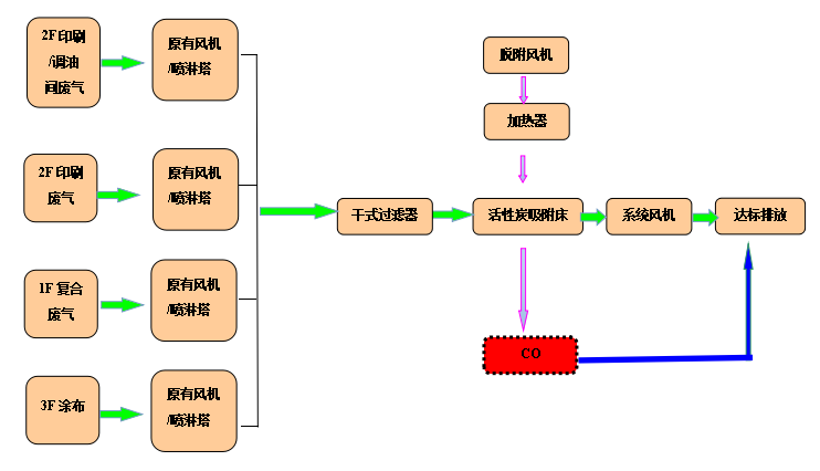 印刷排氣系統(tǒng)合并后處理,保持原有的噴淋塔,有機廢氣先通過干式過濾器進行預處理,預處理后進入活性炭吸附劑床進行吸附,處理后的氣體可直接達標排放。當活性炭飽和后,利用加熱的空氣作為介質,將吸附在活性炭里的有機廢氣吹脫出來,經(jīng)循環(huán)后增濃,即濃縮成高濃度的廢氣后進入催化燃燒裝置,在催化劑的作用下,于200-300℃時分解成無害化的CO2和H2O后達標排放。