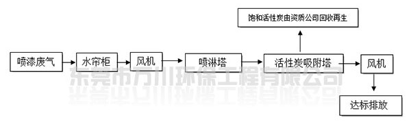 根據廠方提供的資料及現場勘察的情況。其噴漆廢氣的來源主要為無塵噴漆車間內的5條自動噴涂線。在生產過程中有噴漆,該工序產生了一定量含三苯有機廢氣和噴漆粉塵,該廢氣不僅對環(huán)境造成污染,而且對人體有較大的危害作用,同時也破壞了周邊的環(huán)境,造成了不良的影響,需進行處理后排放。我們工程師分析了該廢氣的特點和以往的案例經驗,采用了“水簾柜+噴淋塔+活性炭吸附塔”這套解決方案。