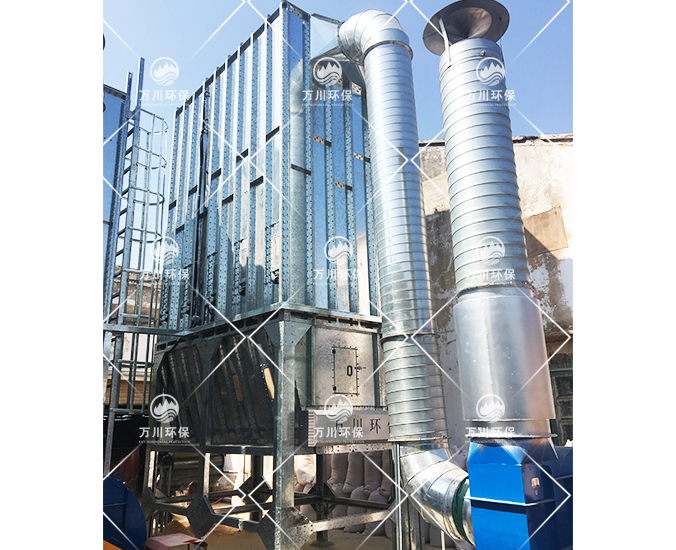 木屑吸入至風(fēng)管,以負壓的形式進入到脈沖布袋除塵器。含塵廢氣進入中箱體下部,在擋風(fēng)板形成預(yù)分離室內(nèi),粉塵因慣性作用落入灰斗。
